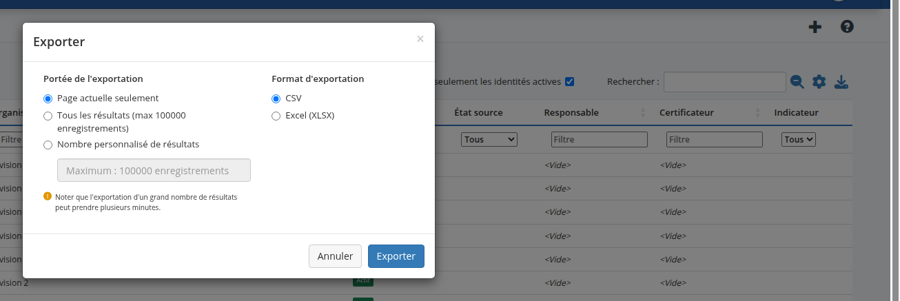 Les listes du portail d’administration intégrées aux DataTables proposent désormais une action pour exporter le jeu de résultats courant (filtres appliqués) en CSV ou Excel, ce qui facilite l’analyse hors des rapports prédéfinis. #474