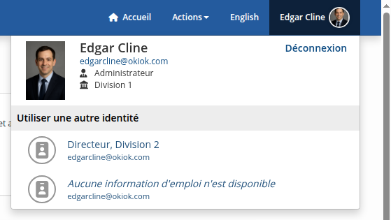 L’utilisateur connecté est présenté plus clairement dans la barre supérieure du portail d’administration et du libre-service, avec photo de profil ronde et information contextuelle. Lorsque le compte d’authentification externe est associé à plusieurs identités, l’utilisateur peut sélectionner l’identité active pour la session afin que la gouvernance, les approbations et les tâches s’appliquent au bon contexte d’emploi. #4250 #4379