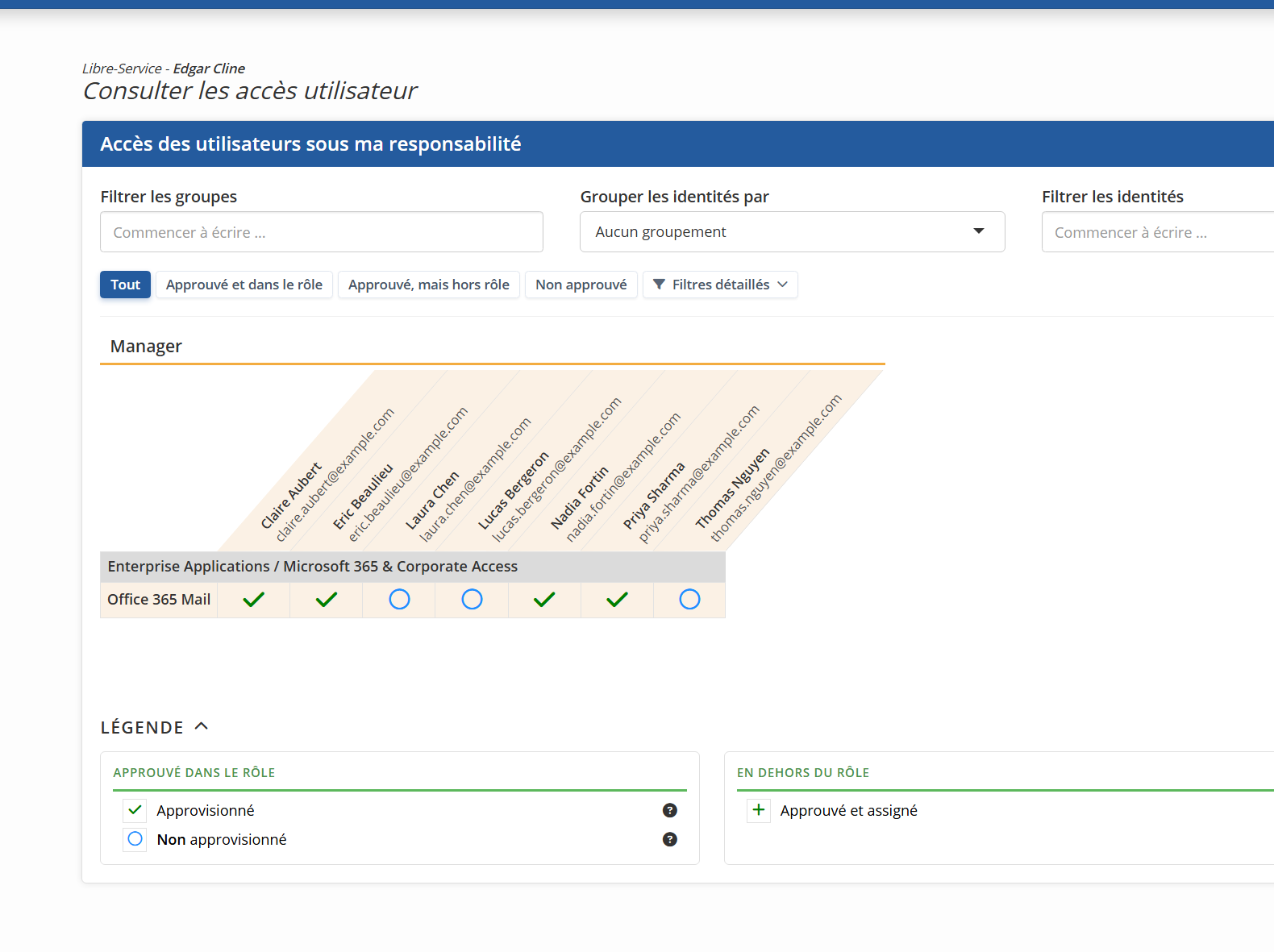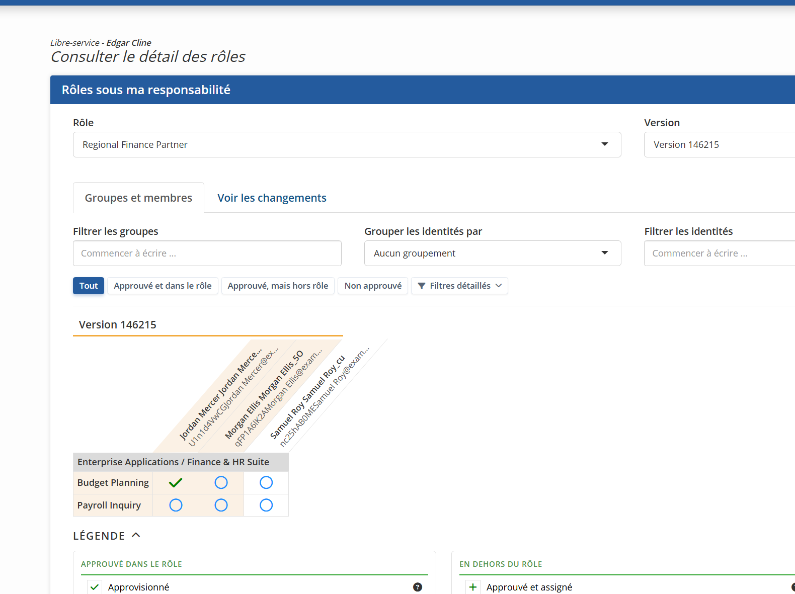 Un nouvel écran en libre-service présente une vue matricielle des accès et des groupes des identités dont l’utilisateur a la responsabilité, sur le modèle des grilles de révision des campagnes de rôles, afin d’aider les gestionnaires à voir la répartition des accès. #4190