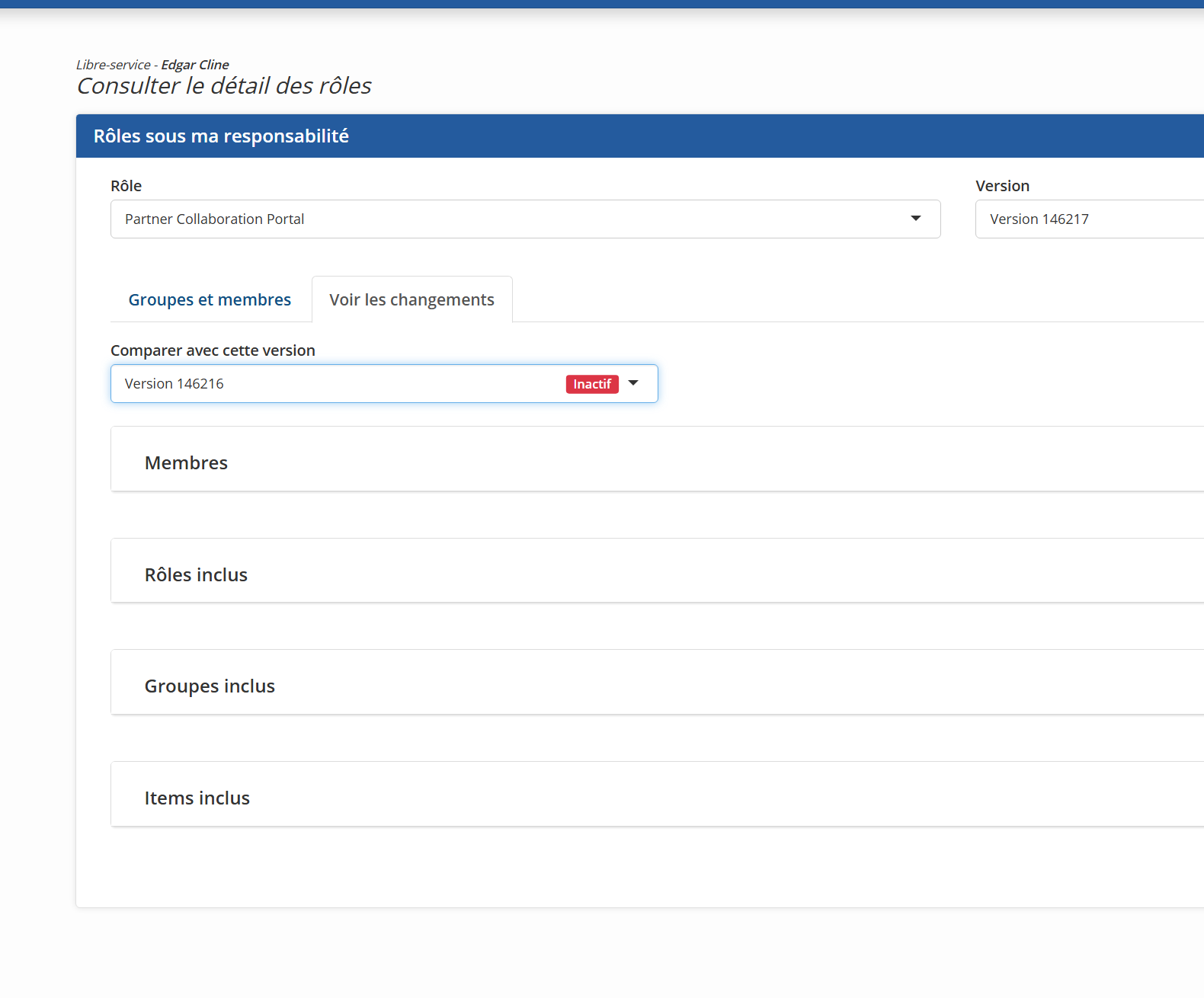 Les propriétaires de rôle peuvent consulter un écran dédié : choix de la version affichée, matrice des accès et panneaux mettant en évidence les écarts par rapport à la version active lorsque l’on consulte une version non active. #4194